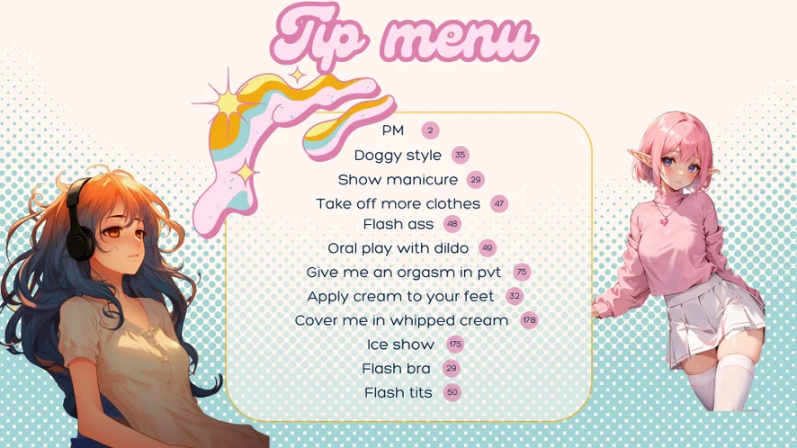Ahegao, Spanking, Twerk, Yoga, Hæle, Læder, Madlavning, Massage, Nylon, Kontor, Fodfetich, массаж ног, Dirty talk, Topløs, Rygning, Dildo eller vibrator, Elskerinde, Blottelse, Orgasme, Cowgirl, Upskirt, Cuckold, Rollespil, Sexlegetøj, Olieshow, Striptease, Erotisk dans, Doggy style, Cosplay, Onani, Brystsex, Blowjob, Bedømmelse af pik, Facesitting, Onaniinstruktion, Sprøjt, Footjob